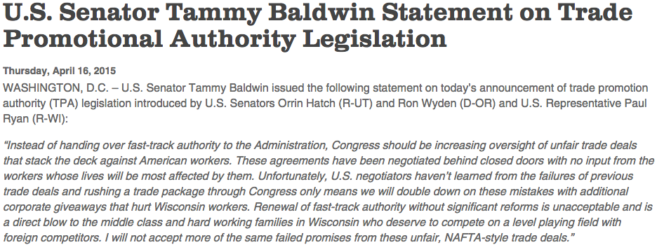 Statement on #TPA bill to fast track #TPP: http://www.baldwin.senate.gov/press-releases/us-senator-tammy-baldwin-statement-on-trade-promotional-authority-legislation …pic.twitter.com/qKHJUYdbc6