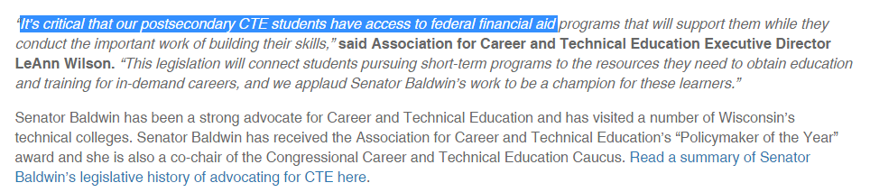 Read why @actecareertech Executive Director LeAnn Wilson supports the #CTE Opportunity Act: http://www.baldwin.senate.gov/press-releases/baldwin-leads-efforts-affordable-higher-education …pic.twitter.com/9tVtiU0Ng9