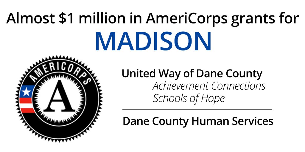 .@AmeriCorps grants will help @unitedwaydaneco & Dane County Human Services boost tutoring & engagement programs.pic.twitter.com/e9O01mH4xZ