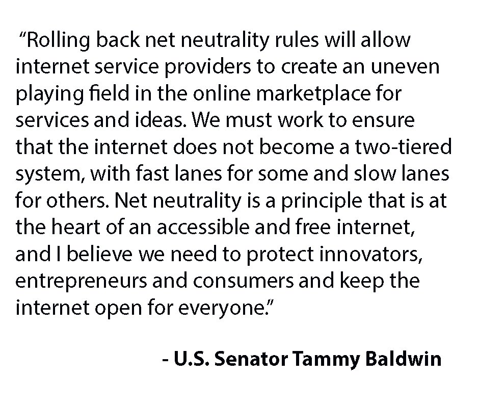 Thank you Senator Baldwin for your leadership in this topic, I have left a voicemail with my vehement support of keeping the existing laws regarding net neutrality in place. I will support you in all upcoming elections. Thank you. -Hunter Angell
