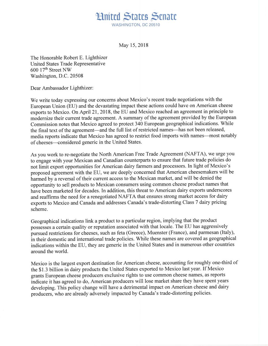 I have led a bipartisan effort with @SenToomey calling on the Trump Administration to protect American dairy & cheese from European trade initiatives that would require producers to change the names of cheeses they’ve made for generations.pic.twitter.com/Fi93no0tMW