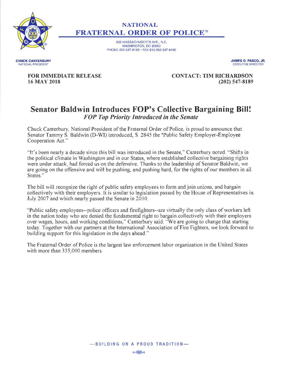 FOP is proud to announce @SenatorBaldwin introduced the FOP's collective bargaining bill which is a top priority of ours. The "Public Safety Employer-Employees Cooperation Act" will recognize the rights of public safety employees to form and join unions, and bargain collectively! pic.twitter.com/auWfjZx9Wy