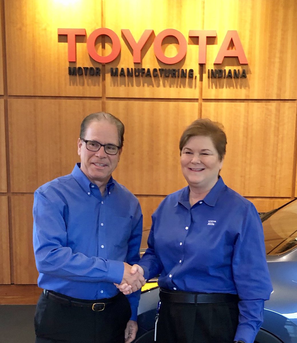 Great minds think alike. Thanks to Millie Marshall, President of @Toyota Motor Manufacturing Indiana, for showing me around their impressive plant here in Princeton. @ToyotaMotorCorp @ToyotaPolicypic.twitter.com/yj9G1WvGV2