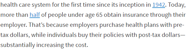 The article is wrong - people get their healthcare thru their employers because the group discount for all the employees is significantly greater than anyone could get in an individual policy, simply because the pool of people is smaller. That's how insurance works, you tool.pic.twitter.com/vo9GWjU9wF