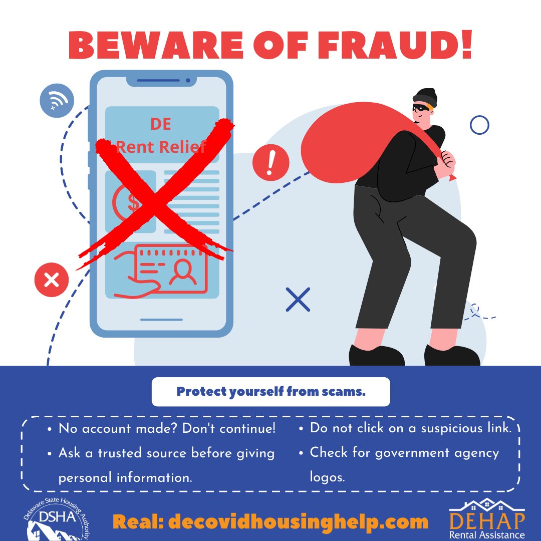 Be aware of fraudulent websites mimicking the DEHAP Rental Assistance website. Anyone needing to apply or address concerns regarding the DEHAP Rental Assistance program should go to the official DSHA website here: https://decovidhousinghelp.com/ .pic.twitter.com/V6MIUDejiy