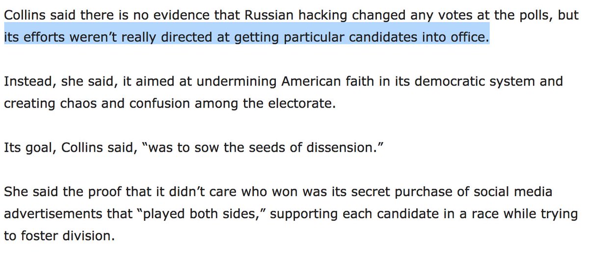 Report: Collins, rejecting US intel consensus, claims Russia didn't care who won in 2016 http://bit.ly/2myhjdQ  #mepolitics @asfried pic.twitter.com/RS1Xq0QoX4 @tedlieu @RepAdamSchiff @RepSwalwell @SenJeffMerkley @chelseahandler @maddow @JoyAnnReid @RWPUSA @votevets @jaketapper