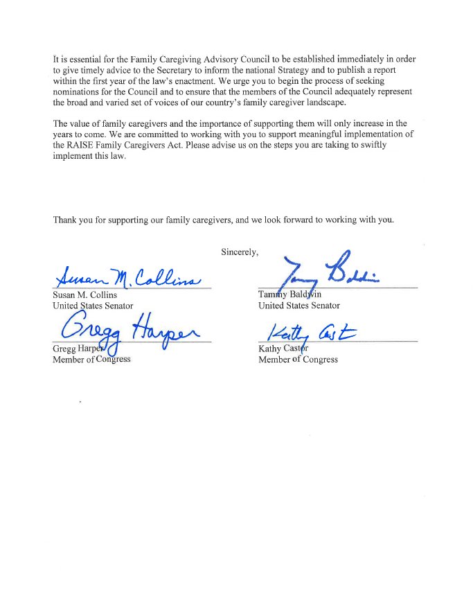 Earlier this year, a bipartisan bill I authored with @SenatorBaldwin, Rep. @GreggHarper, and @USRepKCastor to support family caregivers was signed into law. Today, we urged HHS to implement this law swiftly to help the nation’s 40 million caregivers. https://www.collins.senate.gov/newsroom/bipartisan-sponsors-raise-act-urge-hhs-implement-new-family-caregiver-law-swiftly …pic.twitter.com/lM0pjzHcDq