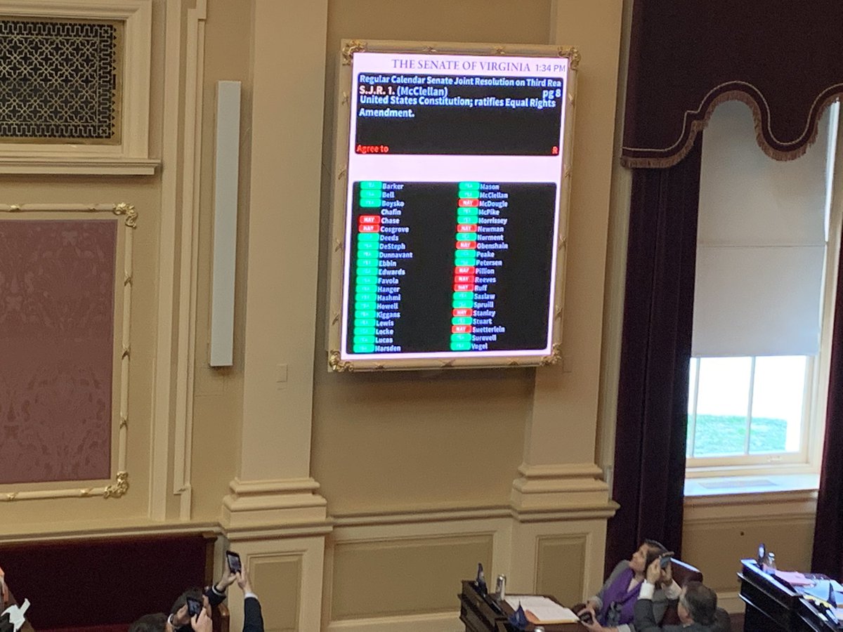 The Senate of Virginia has voted to ratify the Equal Rights Amendment! I was honored to speak for the first time on the Senate floor in favor of the ERA. This vote was for my constituents, my wife, my daughters and granddaughter, and especially my mother.pic.twitter.com/mvXnOC8QLX