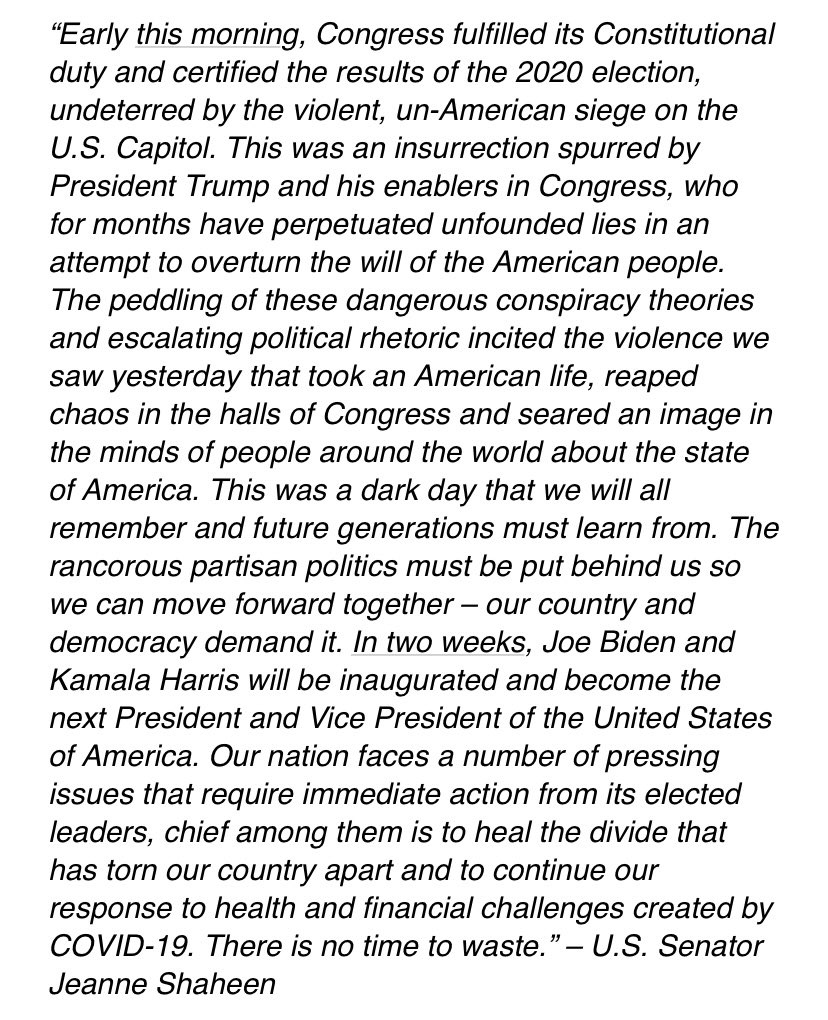 Early this morning, Congress fulfilled its Constitutional duty and certified the results of the 2020 election, undeterred by the violent, un-American siege on the U.S Capitol. My full statement:pic.twitter.com/fDYAkusEy8