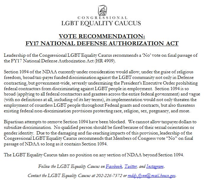 Yet one co-chair of @LGBTEqCaucus voted for #NDAA17 with that anti-LGBT provision: @RepSinemahttps://twitter.com/LGBTEqCaucus/status/733042709410287616 …