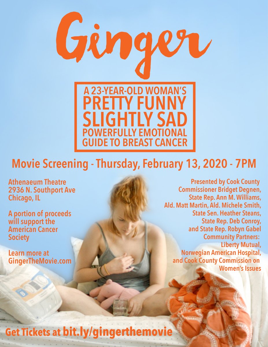 #GingerTheMovie this Thursday, Feb. 13. Filmed in Chicago, the movie based on a true story of the co-director's breast cancer diagnosis at age 23. A portion of proceeds will benefit the#AmericanCancerSociety. Tickets at http://bit.ly/gingerthemovie .pic.twitter.com/dAmiEZ8gmy