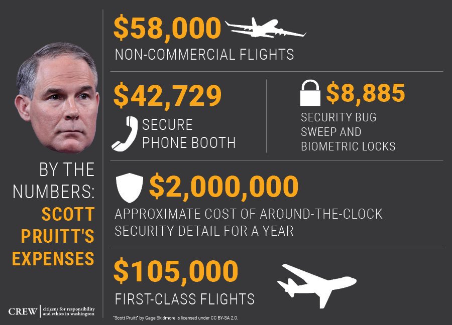 But that isn’t all—he's done this while making a mockery of ethics laws that protect taxpayers from government waste and fraud. He's taken $100,000s from taxpayers & spent it on perks for himself, while trying to slash the budget for the EPA's critical health & safety programs.