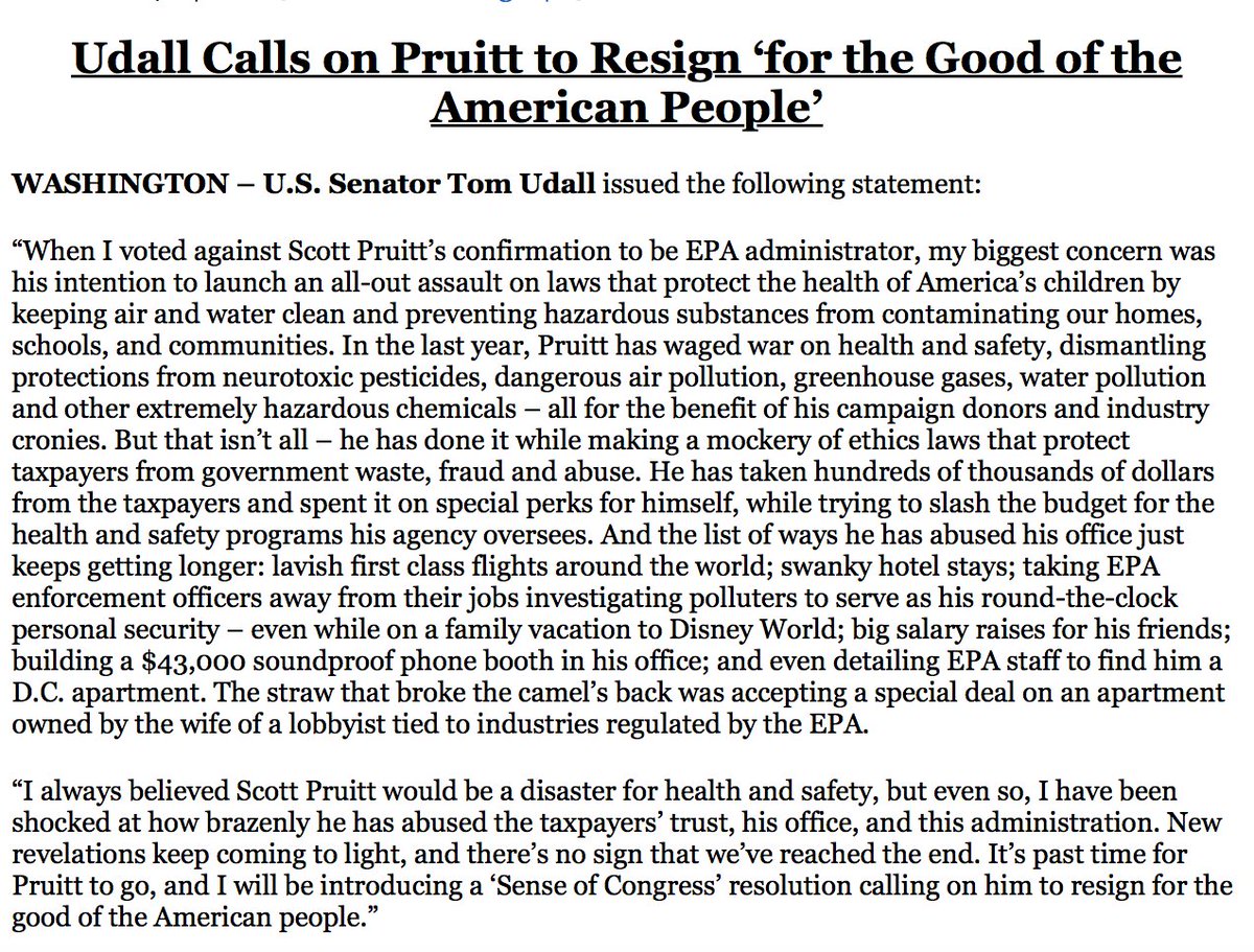 I always believed Pruitt would be a disaster for health & safety, but I've been shocked at how brazenly he has abused the taxpayers’ trust & his office. It’s past time for him to go. I'll introduce a resolution soon calling on him to resign for the good of the American people.