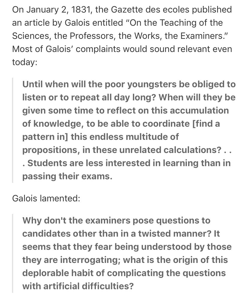 Galois was way ahead of his time. He died at the age of 20, but changed mathematics before he did. I just learned his views on math education were also prescient:pic.twitter.com/BHRtMs2uzt