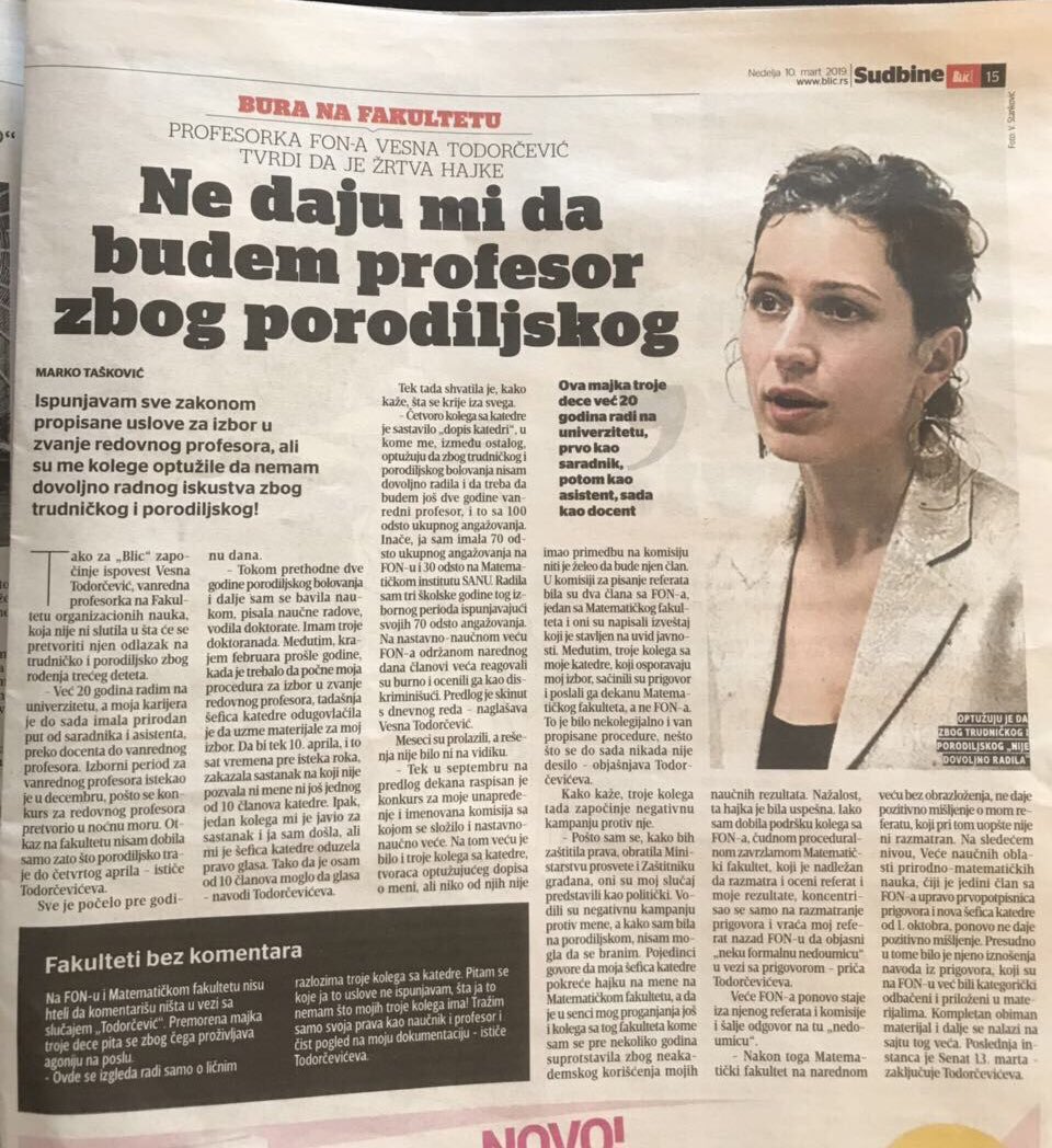 @VidStimac i rekao da profesorki Vesni Todorčević sa FONa preti otkaz zbog porodiljskog. Odmah smo se dali u medijsku akciju i proširili priču u roku od par dana. Danas je Senat Univerziteta u Beogradu presudio u njenu korist. Vesna je redovni profesor!https://twitter.com/serdjosega/status/1099402863393099776 …Show this threadThanks. Twitter will use this to make your timeline better. UndoUndo -