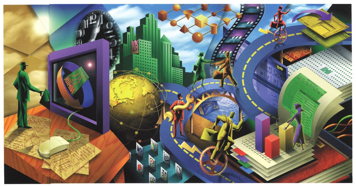 There was a strange wave of corporate cyber-cubist/surrealist-collage imagery in the 1990s, like these artworks by one of my favorite designers, Glenn Mitsui (~mid 1990s)pic.twitter.com/0p4VSrWBFv