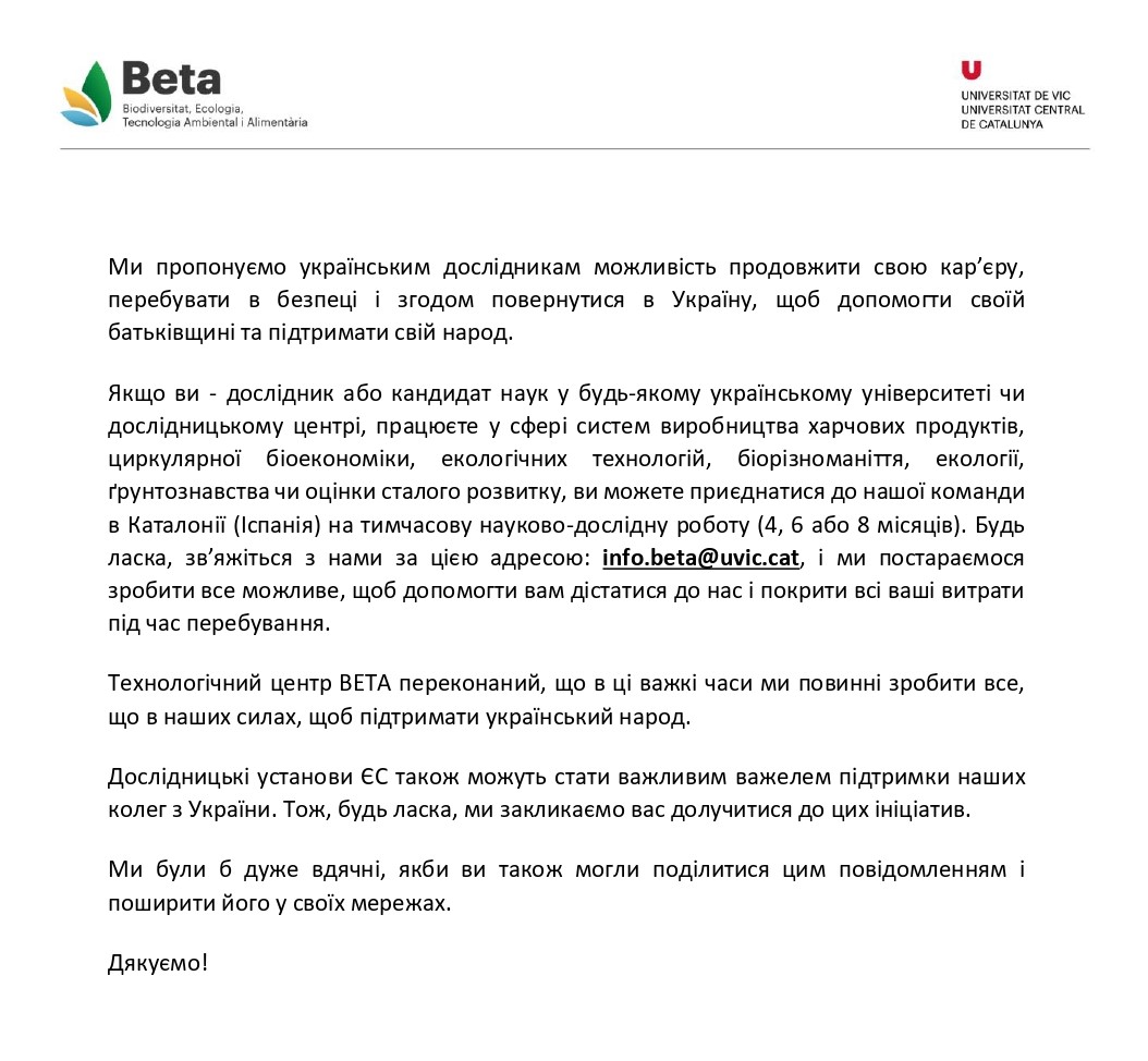 El CT BETA ofereix al personal investigador d’#Ucraïna la possibilitat de continuar temporalment la seva carrera en aquest centre