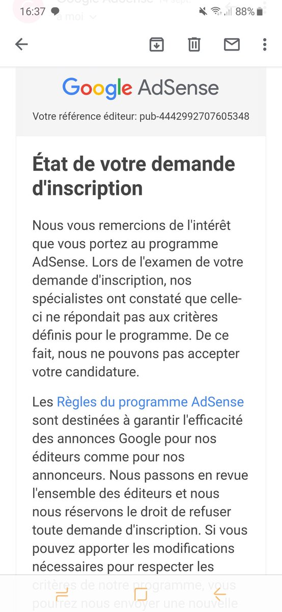 Merci pour ces informations. Utilisiez-vous ce compte AdSense pour votre chaîne YouTube ou à des fins différentes ? Aussi, pourriez-vous nous envoyer une capture d'écran du message de refus que vous obtenez ? Nous attendons votre retour.