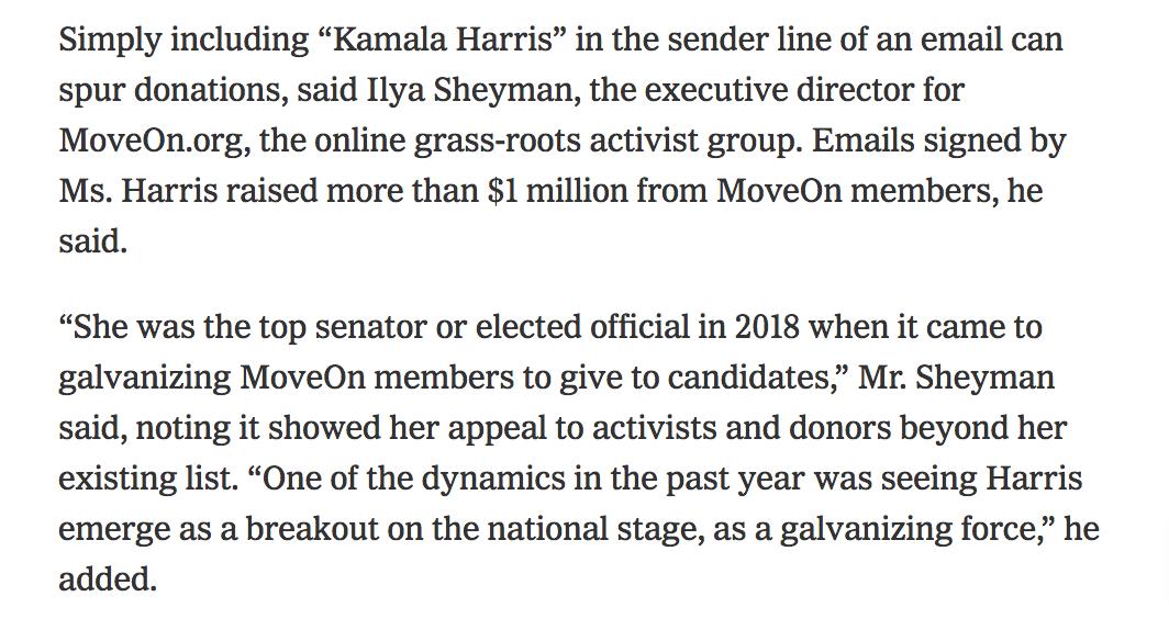 This didn't just happen. Harris spent $5 million (mostly on Facebook) prospecting for donors in 2017-18. And because much of her fundraising was either split or for others she mostly kept power of her list hidden.https://www.nytimes.com/2019/03/26/us/politics/kamala-harris-fundraising.html …
