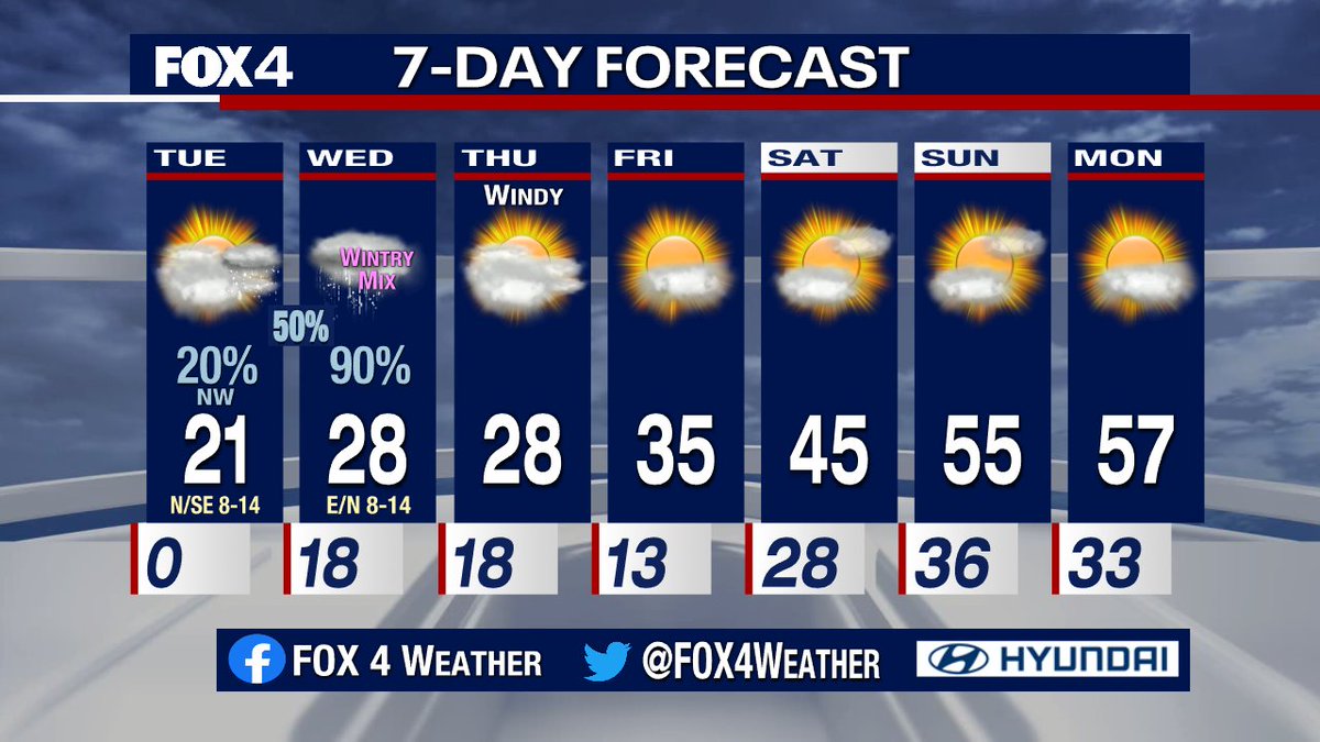 Dangerous, record-breaking temperatures continue! The next storm system brings snow and a wintry mix to North Texas Tuesday night into Wednesday. We finally climb back above freezing Friday afternoon.pic.twitter.com/yJOdzLg2g0