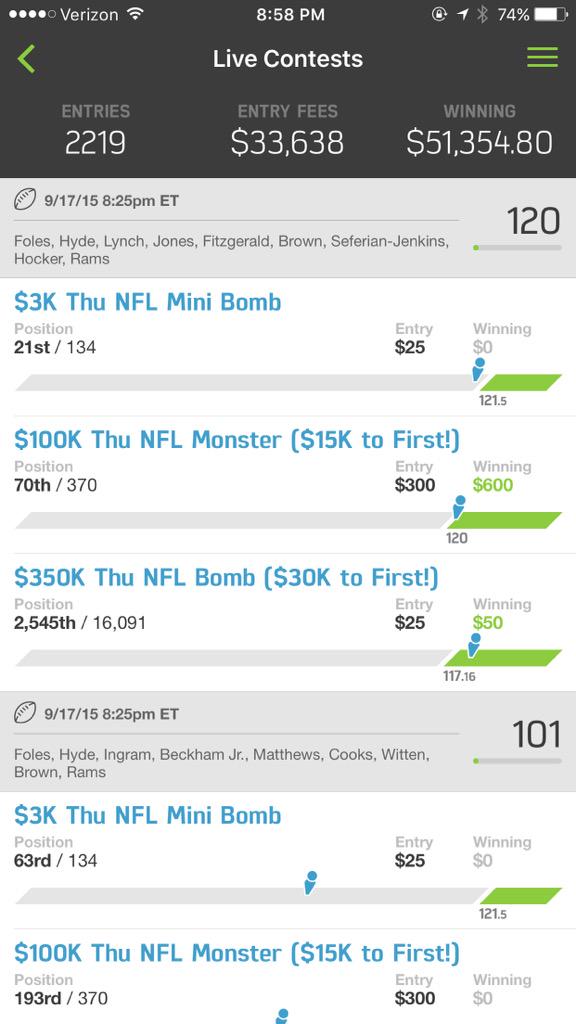 @FanDuel and@DraftKings#NFL lineups sent!Thanks. Twitter will use this to make your timeline better. Undo -
