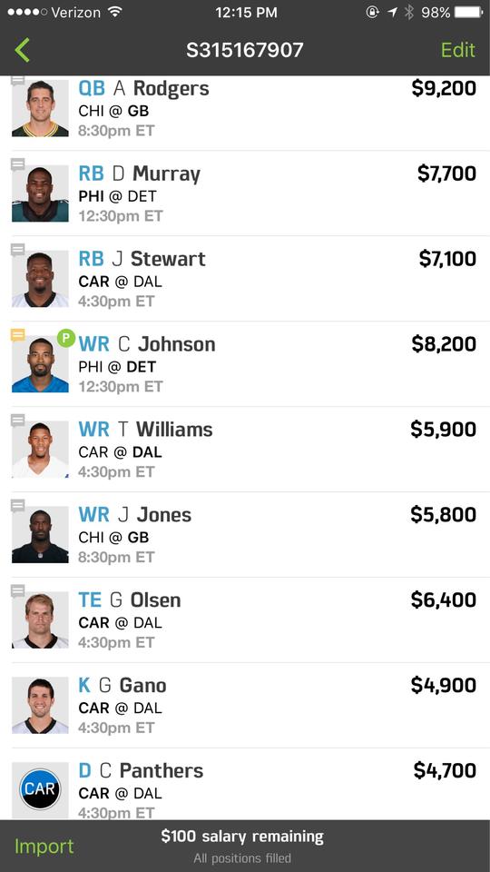 FanDuel NFL 11/26 12:30PM (3 Games) lineup: Rodgers, Murray, Stewart, Tate, Cobb, Jones, Olsen, Gano, Packerspic.twitter.com/bUfZmrlXRz