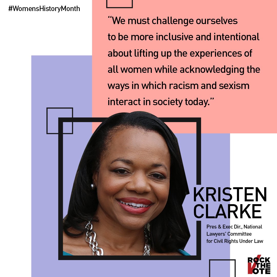 I love this from @RockTheVote and whole-heartedly agree that @KristenClarkeJD is someone who deserves to be celebrated during #WomensHistoryMonthhttps://twitter.com/RockTheVote/status/1102600320260210688 …