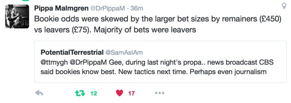 Bookies had 83% Remain early and 83% Leave late in day. If media reported sentiment honestly maybe markets ok