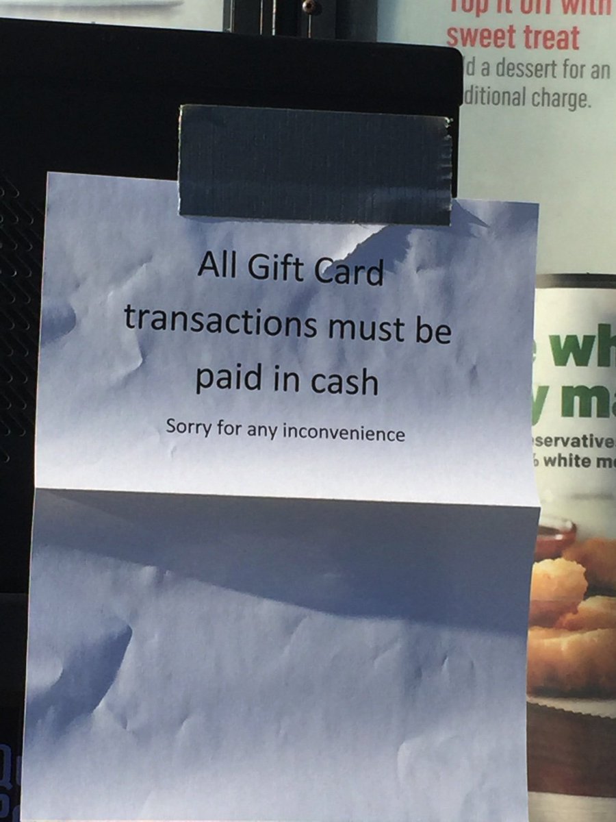 I'm guessing it means you have to purchase gift cards with cash, no credit cards. Either that or somebody is very confused.