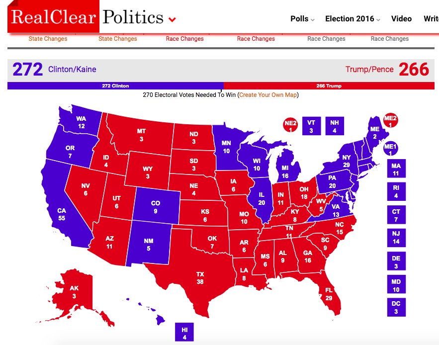 This is the RealClearPolitics "no tossup" map. All coming to pass except he also won Wisconsin. That gives him the win.I think.pic.twitter.com/14z6kupRsk