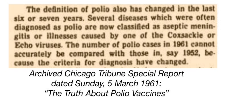 5 March 1961 Chicago Tribune Special wrote that not only was polio was a rare disease, its incidence increased with the vaccines, government manipulated the data & tests showed fewer than half of the vaccinated developed antibodies.http://archives.chicagotribune.com/1961/03/05/page/62/article/the-truth-about-the-polio-vaccines …