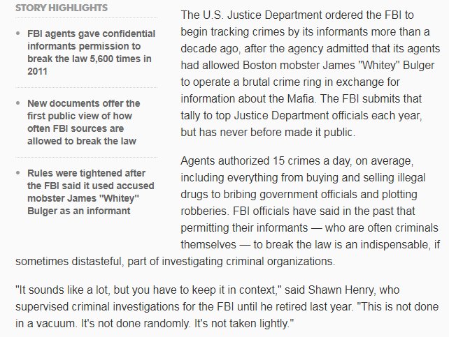 2013: Exclusive: #FBI allowed informants to commit 5,600 crimes New documents show FBI agents gave their informants permission to break the law thousands of times in 2011. Jeesh. "It's not taken lightly" https://www.usatoday.com/story/news/nation/2013/08/04/fbi-informant-crimes-report/2613305/ …pic.twitter.com/5A15C4yvE3