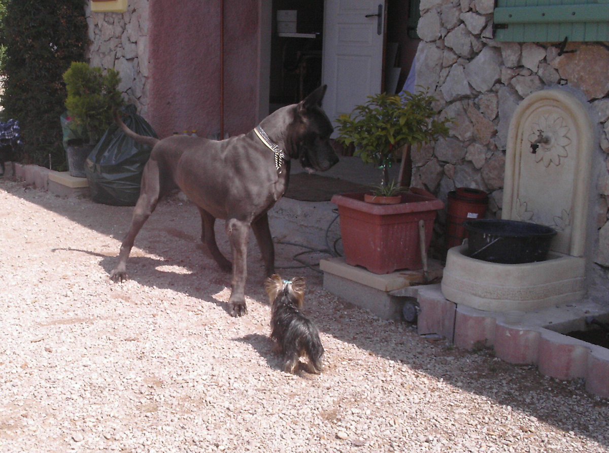 My 6 pound Yorkie just succeeds to scare the 150 pound Danepic.twitter.com/tigli466uC