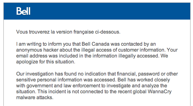 @Bell Canada customer data breach, be aware of possible "spoofed emails" later on asking for sensitive info.pic.twitter.com/szi3SU7D32