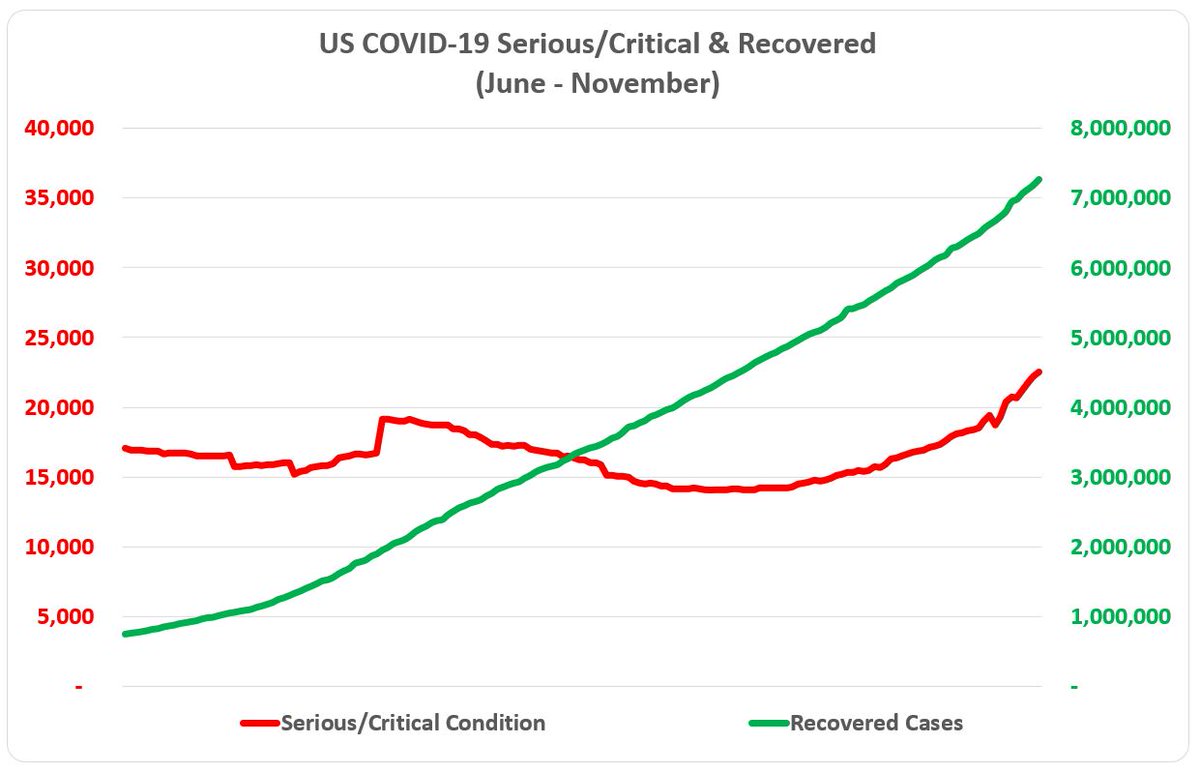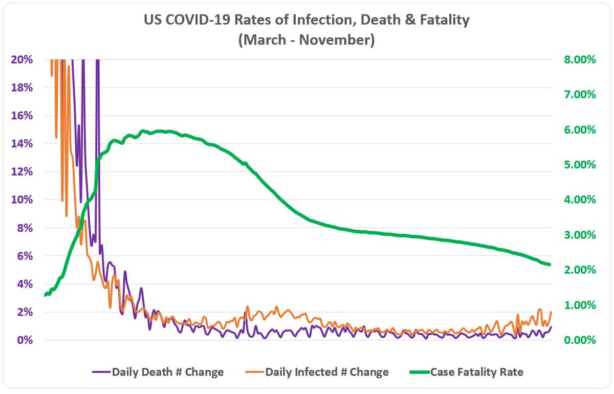 Nov 20th US COVID-19 Update 1) More Infections in Nov than March-June combined 2) Over 200K Infections past 24H (!) 3) Projecting to end Nov w/ 4.7M Infections & 35.8K Deaths 4) Only 1 State reducing Infections (MS; doing great since mid-July!) 5) Case Fatality Rate under 2% nowpic.twitter.com/iYp8AIUgWL