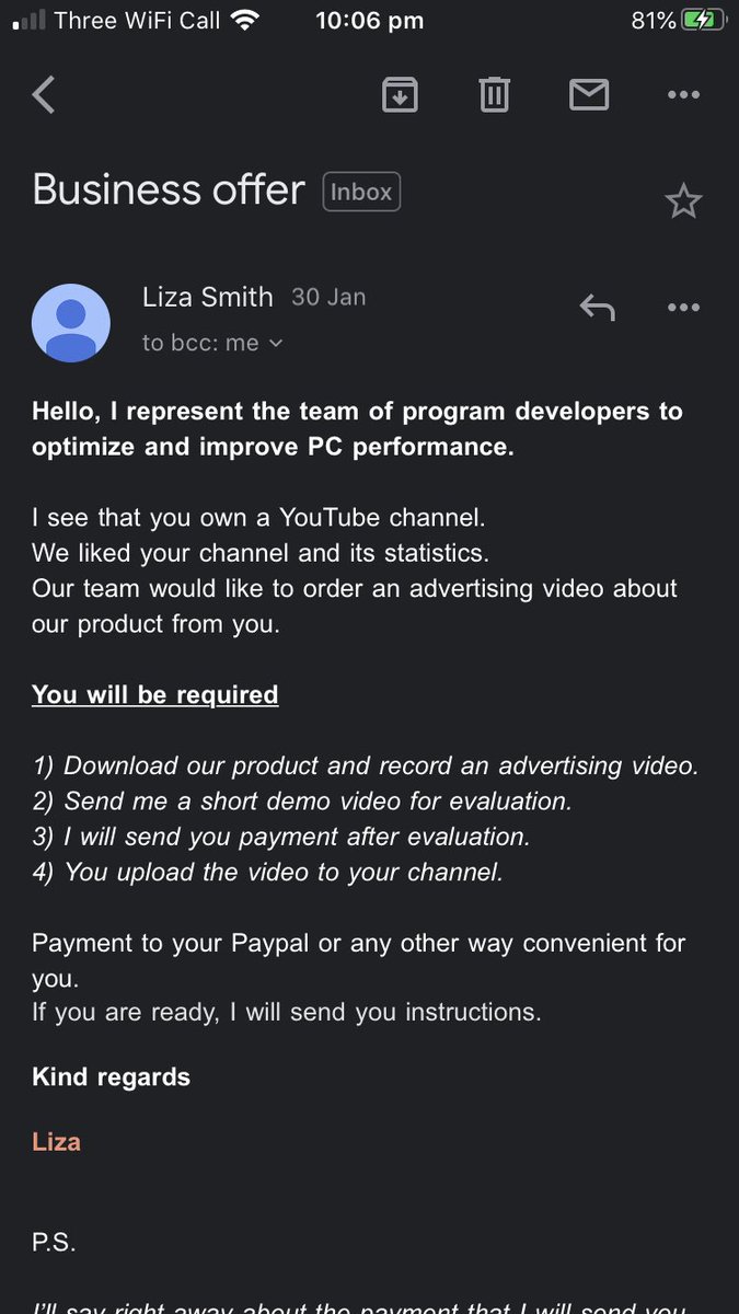 If you get this email from any company for a business offer, please beware...it’s a scam! They wouldn’t confirm what company they worked for and after investigation, I found out that it was a way to hack accounts and steal information. https://www.scammer.info/d/30501-the-fake-game-recorder-trahony …pic.twitter.com/EtUG6lMn0zOvo je potencijalno osjetljiv multimedijski sadržaj. Saznajte više