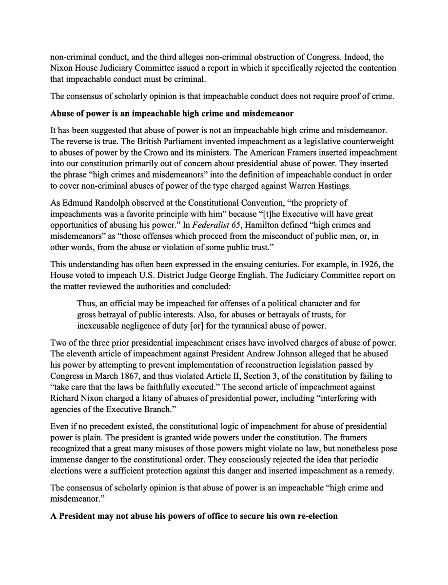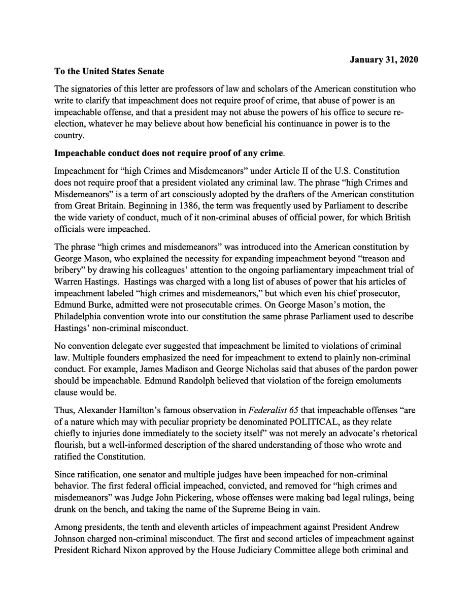 Today, the Senate received this powerful letter from 100 legal scholars and leading impeachment experts from across the country, pointing out that abuse of power & non-criminal acts are impeachable and “a president may not abuse the powers of his office to secure re-election.”pic.twitter.com/ocsWEKgwUc