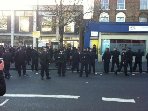 The police are kettling people protesting peacefully about pensions outside the library on dalston lane