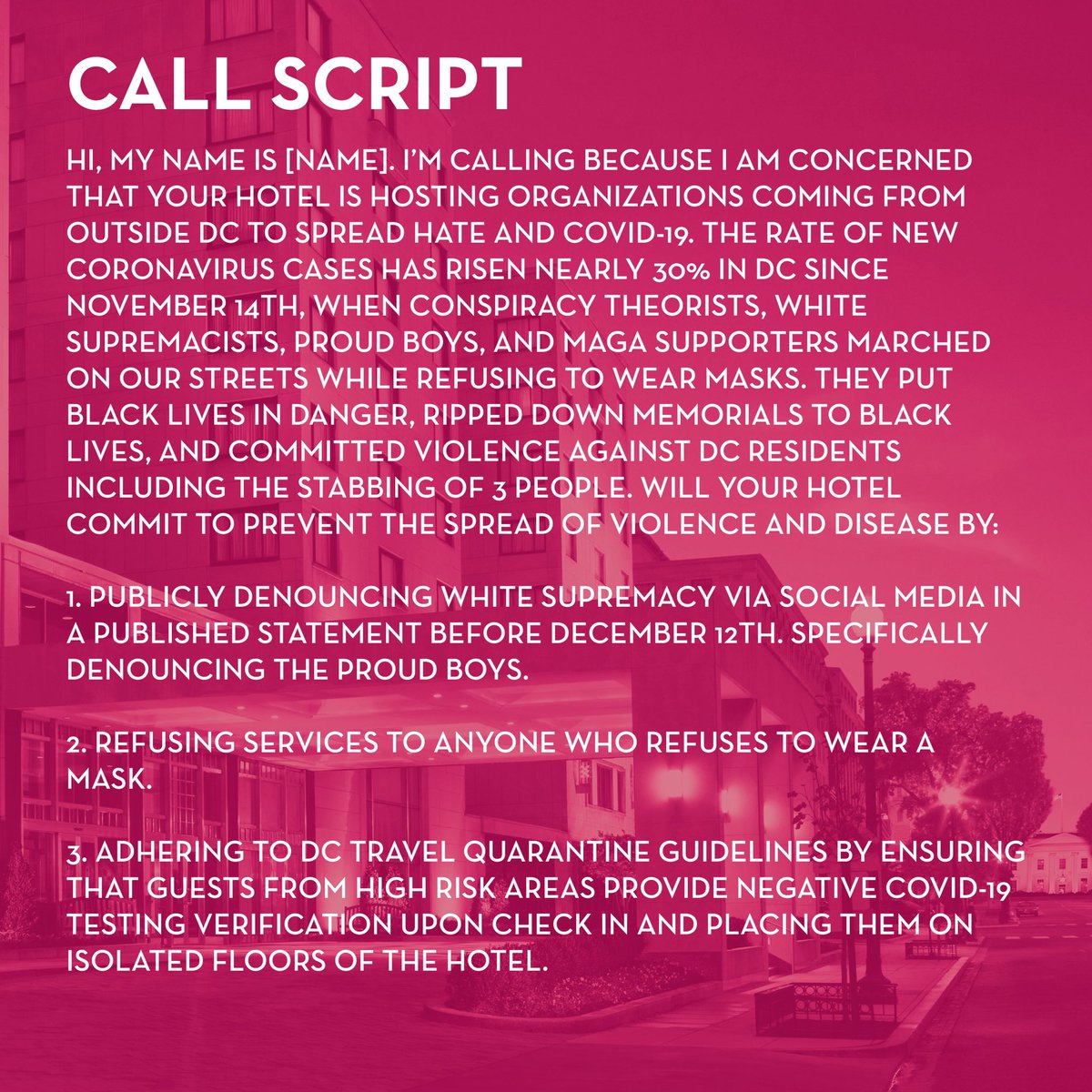 #Resisters can do: call these hotels and follow the script. TY from all of us here in DC!#DefendDChttps://twitter.com/shutdown_dc/status/1335315156847513600 …