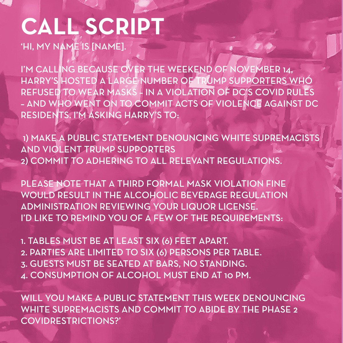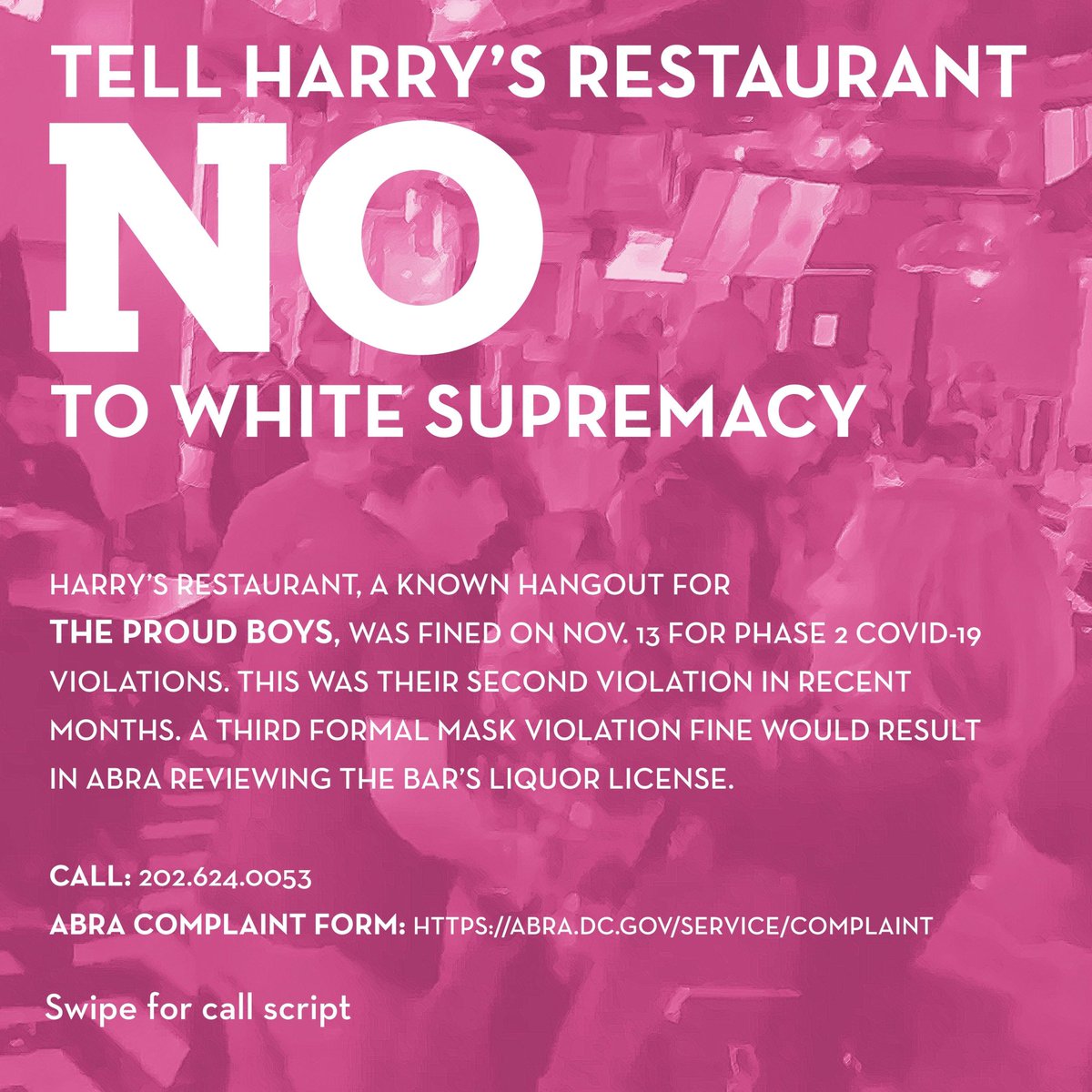 Add this to your to-do list today. Call Harry’s. Tell them to denounce the violent extremists that frequent their business while in DC. They also need to refuse to serve people who do not wear a maskhttps://twitter.com/shutdown_dc/status/1336004358417354753 …