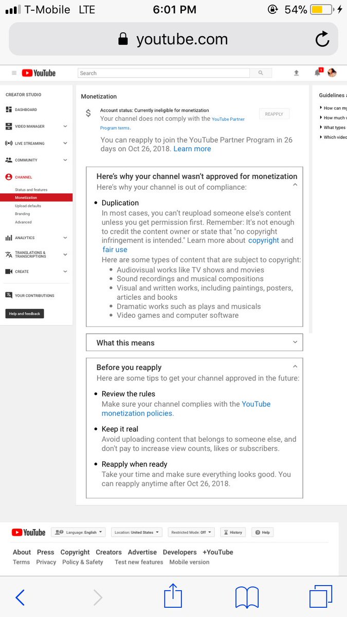I already know about the whole duplication issue and everything and how it says I have to comply .. I was told I was getting a second review my channel is copyright free and I need someone to manual check this, its an error and I was promised a second review please check pleasepic.twitter.com/aLe7h55rJ7