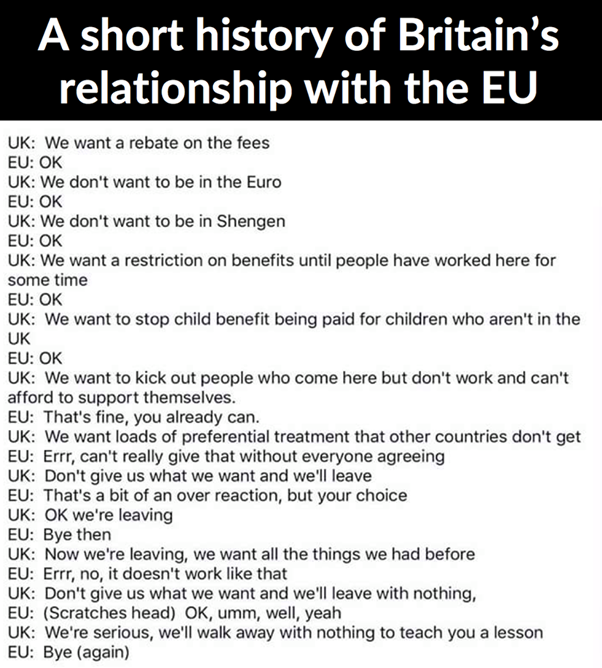 Fuckwit. Go back and do the same timeline for the 15 yrs up to the Brexit referendum and explain all of the european court decisions, tariff choices e.g. sugar cane vs sugar beet (think Tate & Lyle) and where the Ford Transit is now produced - just examples...