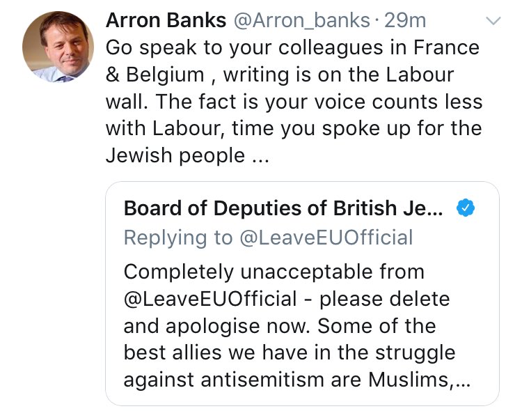 Arron Banks (founder of http://Leave.EU campaign) telling the Board of Deputies that it’s “time you spoke up for the Jewish people”... can’t even find the words.pic.twitter.com/sfx8AcJu47