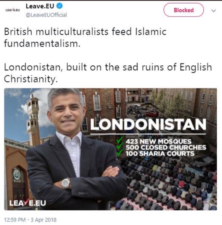 http://Leave.EU are now the reincarnation of Britain First. After BF were rightly kicked off Twitter and FB, I guess http://Leave.EU saw a gap in the market! They should be banned too. Solidarity with Muslims who face this continued onslaught.pic.twitter.com/y1ma5h0Z37