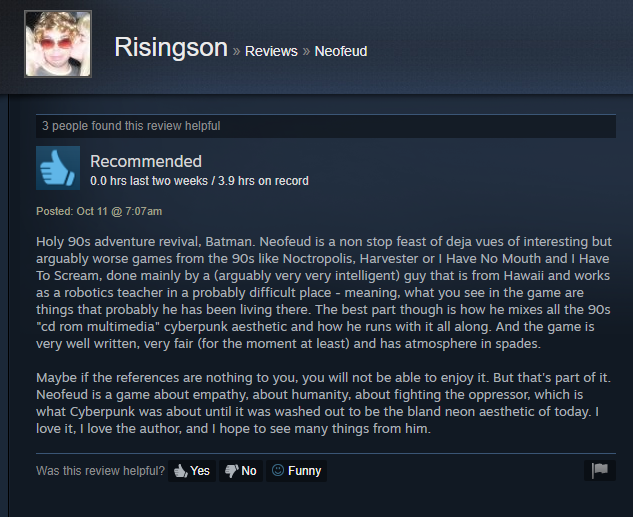"This game is a real gem... There were many times the game straight up inspired me. Sometimes it made me laugh, other times it made me mad. You can laugh, you can cry." --Steam Reviewer https://store.steampowered.com/app/673850/Neofeud/ …