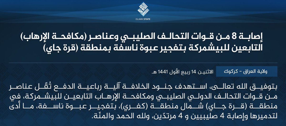 #Irak l’#EI revendique l’attaque à l’IED contre une patrouille commune de la coalition avec les #Peshmerga #Kirkoukpic.twitter.com/U0woyA0ZZO