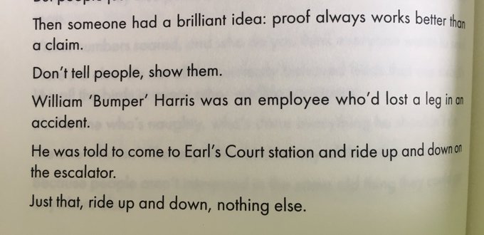 In 1911 London Underground introduced escalators Unfortunately people were too scared to use them Ads explaining escalators were completely safe had no effect Until William 'Bumper' Harris got involved Brilliant example of show, don’t tell from Creative Blindness by