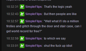 @SimpleFlips "That's the logic yeah, But then people are like 'well what if i do a millionfirsties and glitch through the door and stairc...