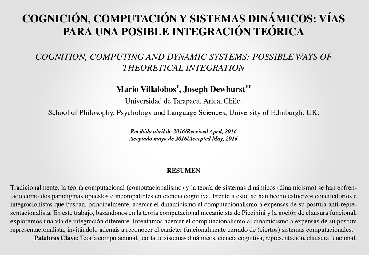 COGNICIÓN, COMPUTACIÓN Y SISTEMAS DINÁMICOS: VÍAS PARA UNA POSIBLE INTEGRACIÓN TEÓRICA Mario Villalobos, DR. Universidad De Tarapacá, Arica, Chile. Joseph Dewhurst, PhD School of Philosophy, Psychology and Language Sciences, University of Edinburgh, UK. https://www.revistalimite.cl/index.php/limite/article/view/57 …pic.twitter.com/Uv7apgx8u0