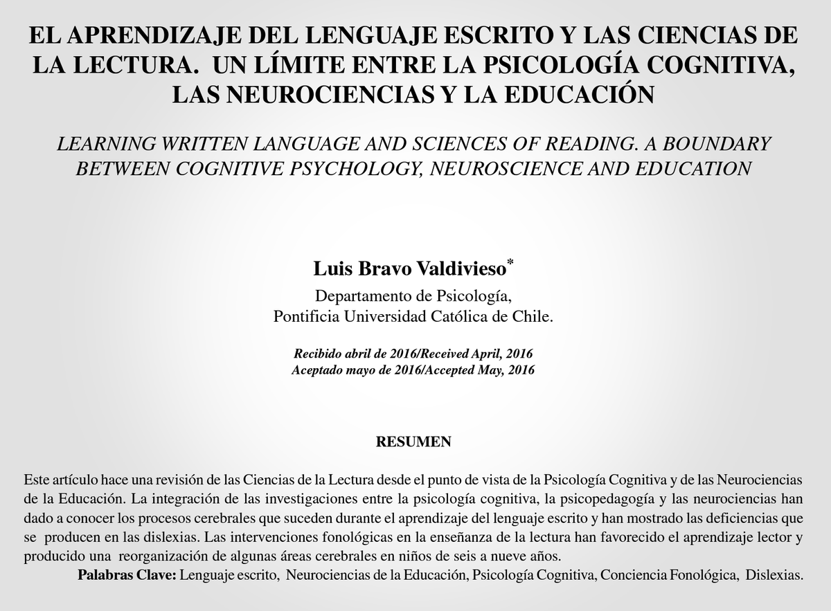 EL APRENDIZAJE DEL LENGUAJE ESCRITO Y LAS CIENCIAS DE LA LECTURA. UN LÍMITE ENTRE LA PSICOLOGÍA COGNITIVA, LAS NEUROCIENCIAS Y LA EDUCACIÓN Luis Bravo Valdivieso, DR. Pontificia Universidad Católica de Chile https://www.revistalimite.cl/index.php/limite/article/view/60 …pic.twitter.com/tS5EbqjQDe